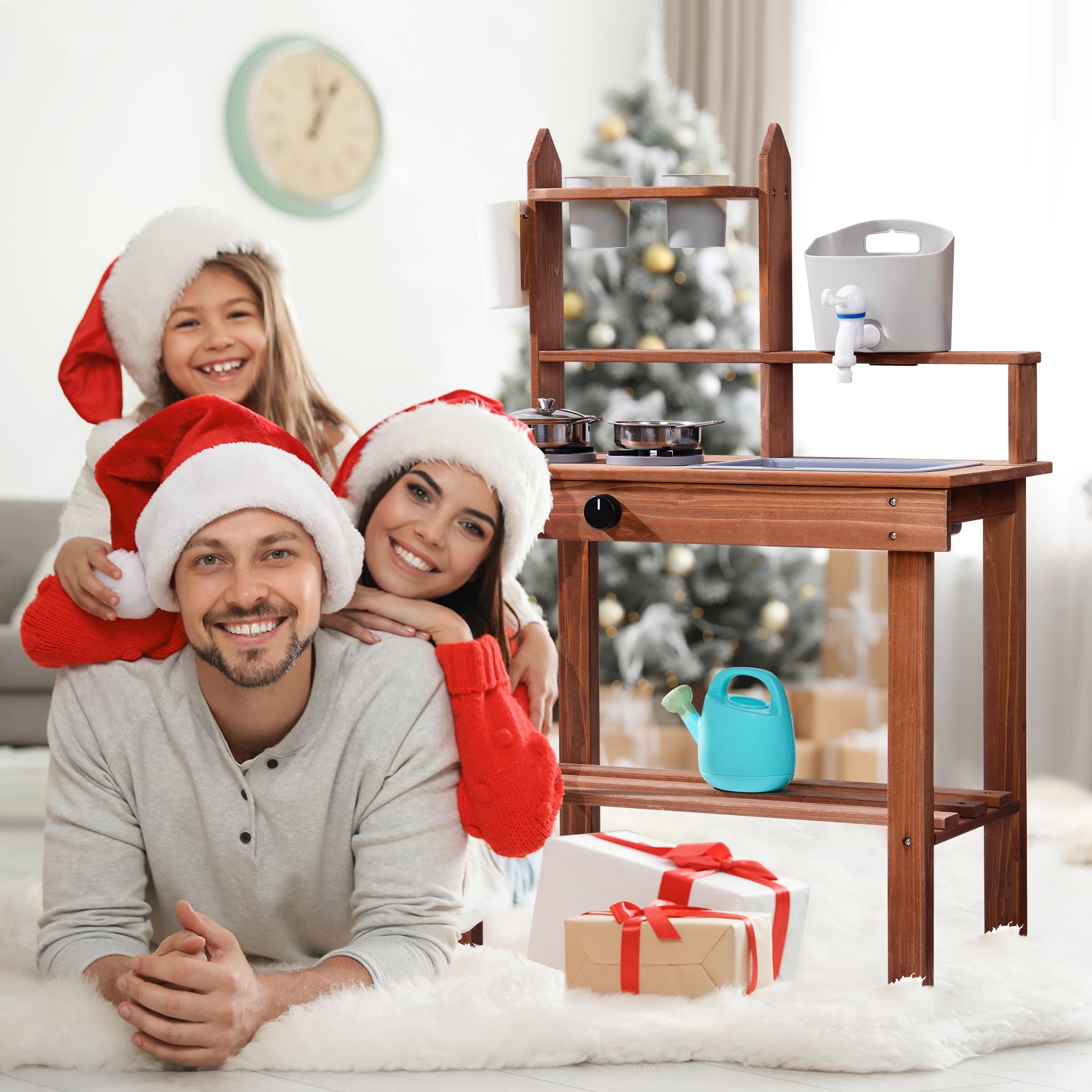 REALISTIC PLAY KITCHEN DESIGN: When kid turn the knobs, this outdoor play kitchen makes a 'clicking' sound to make the game even more fun. Kids can also fill the water tank and turn on the faucet for a real stream of water. Moreover, our sprinkler can be filled with water to water plants. This mud kitchen for kids outdoor will give kids a more realistic experience and can be played with indoors or rolled out to play outside with their friends.