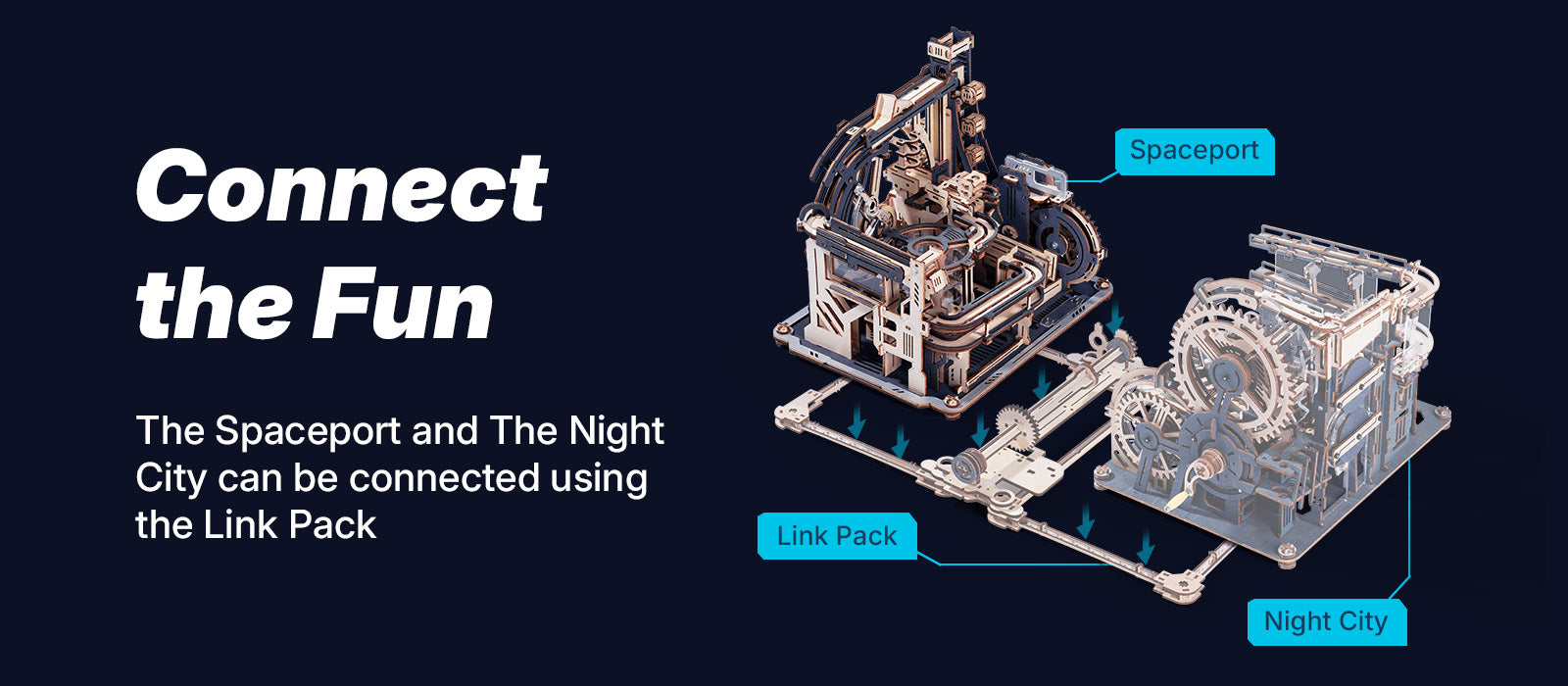 Get ready for a whole new visual feast! This is a marble run model, which is designed in dark gray and dotted with silver. The brand-new product of ROKR Track Maze City, Marble Spaceport (LGC01) was born with the theme of future space technologies. The uniqueness of this marble run lies in its complex mechanical structures, which are 6 diversion mechanisms and 5 tracks. Turning the handle, you can watch steel balls rolling through different tracks. With the highly transparent PC and PS materials, you can clearly observe the movement of each ball. In addition, Marble Spaceport (LGC01) has an upgraded design with two drive modes, which are manual mode and electric mode. Switch between these two modes as you prefer to get more fun.