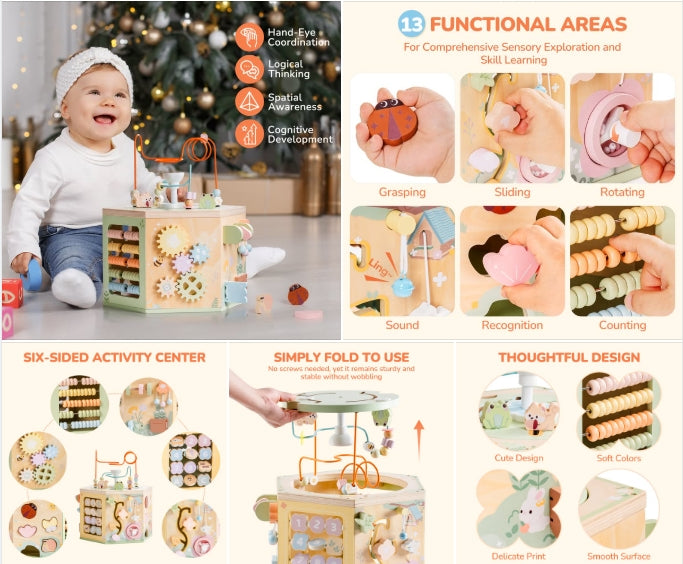 Playtime meets learning in the most exciting way with our new 13-in-1 Activity Cube!From shape sorting to bead mazes, this all-in-one cube features 6 sides of interactive fun and 13 different activity areas—perfect for sparking creativity, building motor skills, and keeping little hands busy for hours!
