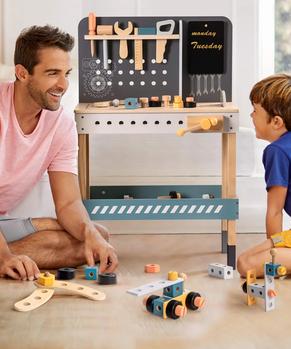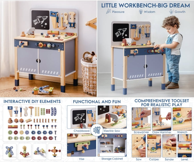 Little builders, big adventures! The Wooden Toy Workbench is packed with interactive fun—featuring a chalkboard for designs, an electric saw for pretend play, a vise for hands-on learning, and a storage cabinet to keep tools tidy!