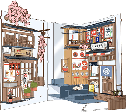 Inspired by Japan's Showa era, where red lanterns glow and cherry blossoms softly fall. Yakiniku grills, ramen shops, and cozy izakayas fill the streets with warmth. Every detail from ukiyo-e rooftops to vintage signs, whispers the romance of quiet nights.
