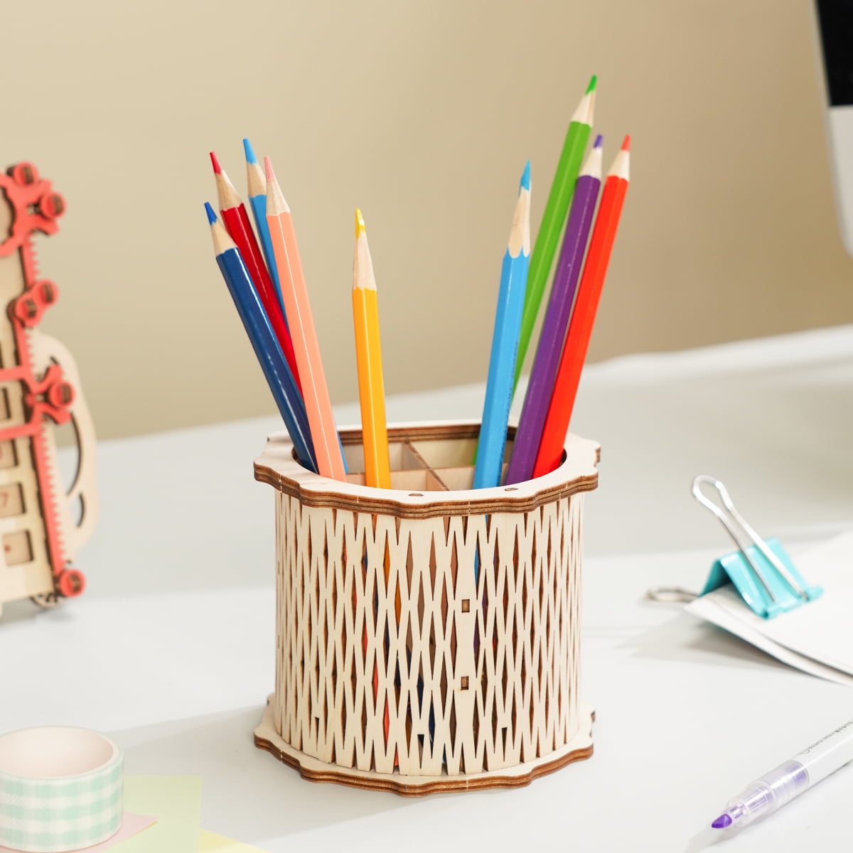 The ROKR Penholder Calendar LC501 is a 3D wooden puzzle that serves as both a stationery organizer and a calendar. It has two modules for the penholder and the calendar, allowing for individual use or combined functionality. The calendar module includes two sliders for precise date settings. The penholder has a minimalist circular hollow design, ideal for storing various stationery items. Additionally, the model is equipped with a slot at the back for easy wall hanging, making it a stylish decoration for both home and office desks.