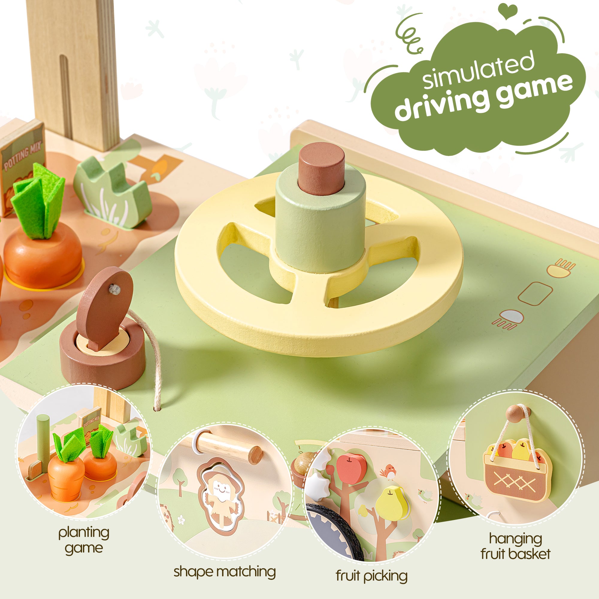 Extra Play Value:This wooden baby walker is very stable and features a farm orchard theme. It integrates a variety of play functions, allowing children to play with gears, animal sliders, and simulate planting. These activities are inspired by Montessori education and are designed to develop children's various skills.