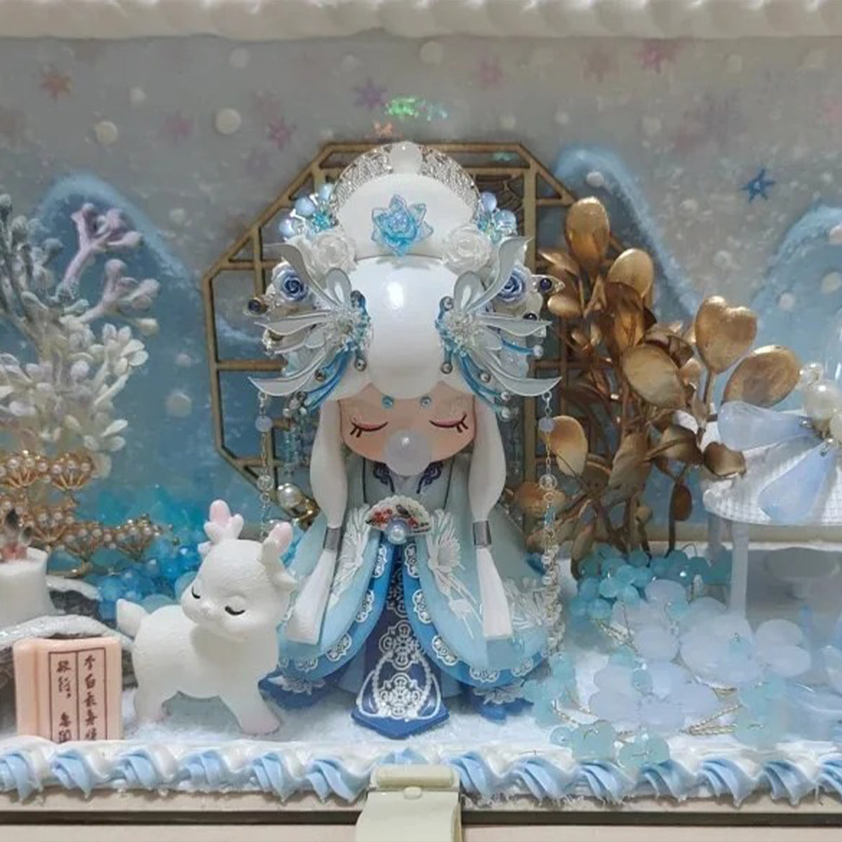 Ik ben helemaal weg van dit prachtige tafereeltje! 🩵❄️ De details van het figuurtje zijn ongelooflijk – van de delicate kroon tot de ijzige blauwe mantel. Ik kan niet stoppen met het bewonderen van de zachte besneeuwde achtergrond en dat schattige hertje. Het voelt alsof een magisch wintersprookje tot leven is gekomen op mijn plank.