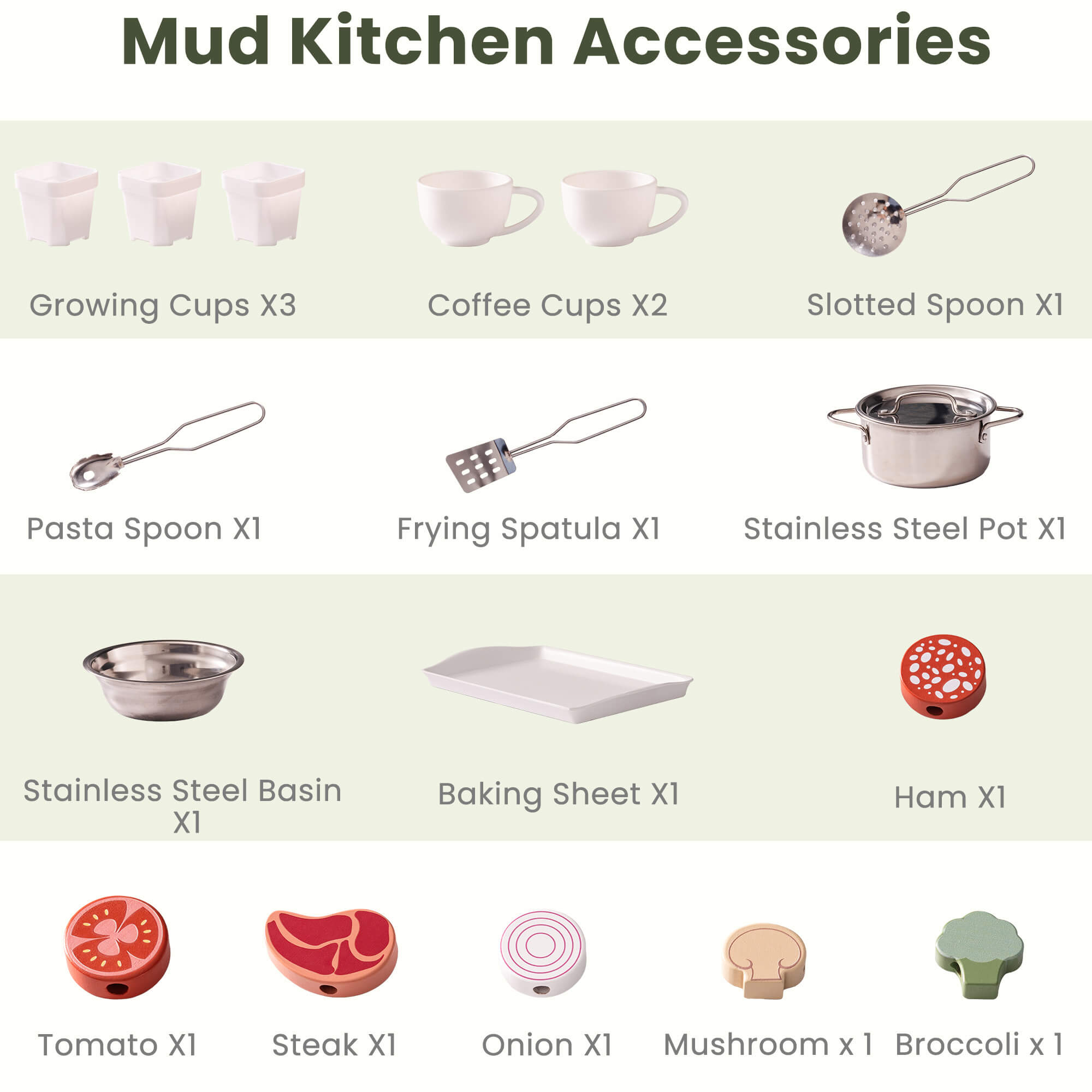 - Durable and Sturdy Construction: Our kids' mud outdoor kitchen for kids is crafted from premium natural solid fir wood, ensuring long-lasting durability for endless outdoor play. Plus, it meets ASTM and CPSC standards, giving parents confidence in the quality and safety of our product.