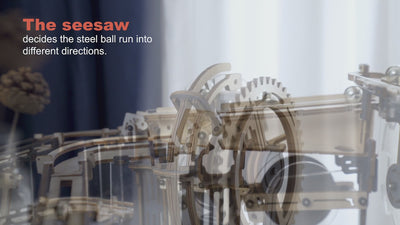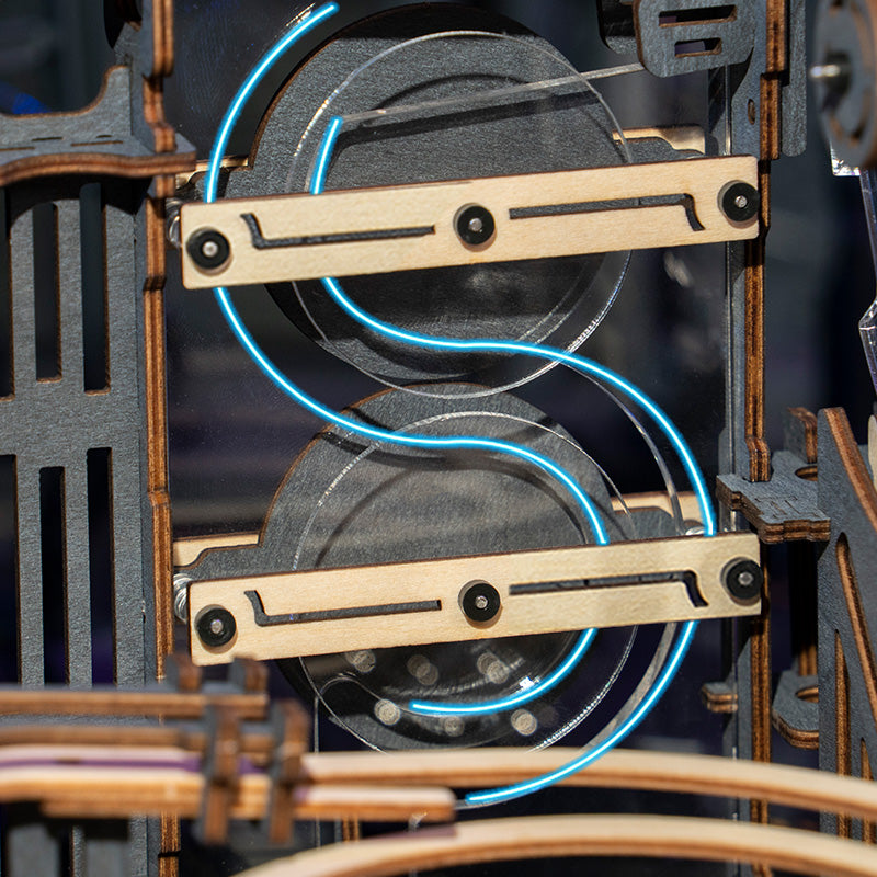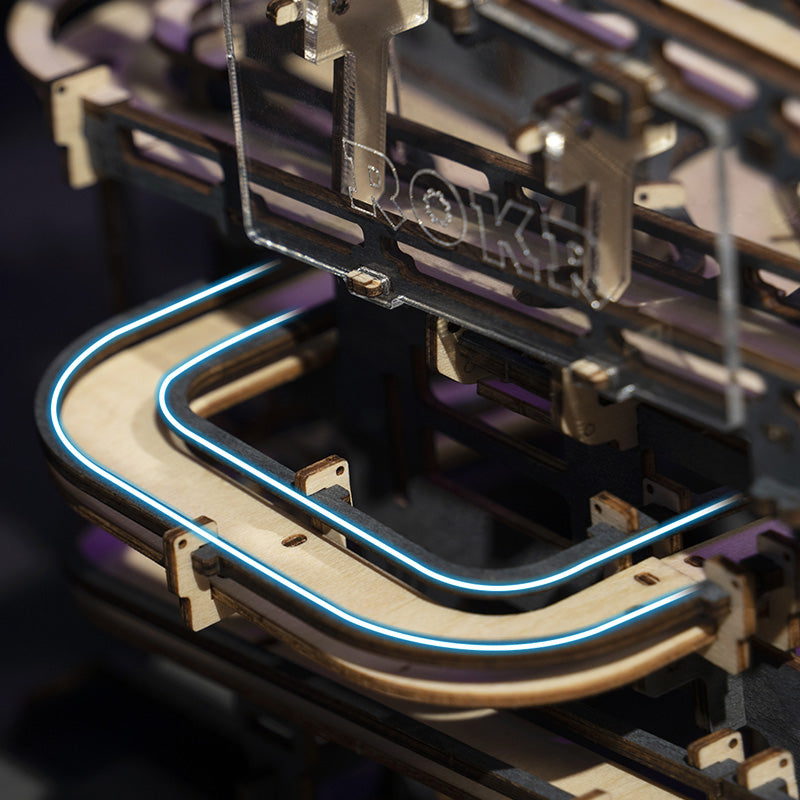 Robotime-ROKR Marble Night City is based on great human engineering. This marble run product combines the beauty of science and machines, involving so many small gadgets. It is a self-assembly 3D wooden puzzle with Tower Distributors & track race balls. Build the set and crank the handle. Watch marbles run crazy down the slopes and twisting turns. Breakthrough material restrictions and incorporate high-transparent acrylic. With a funnel-shaped track, the total length is extended to 2.5 meters. Rotate the handle, the steel ball will reciprocate along the track to experience the creativity of precision machinery with this wooden marble run puzzle.