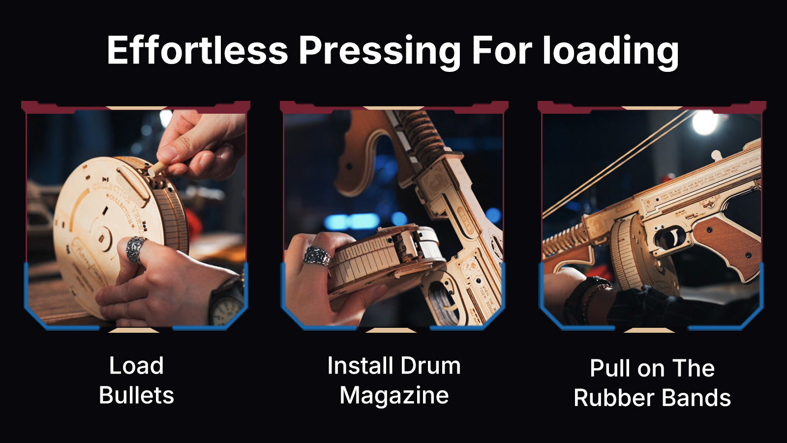 The LQB01 wooden gun toy can continuously fire 10 rubber bands. Detachable drum magazine is equipped with 10 wooden shells for distinctive throwing effect. It fires at high speed 5 per second, with shooting range of up to 8 meters. You can assemble this 3D puzzles and play it with family or friends.