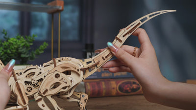 Let's travel 65 to million years back and encounter the Velociraptor, a medium-sized dinosaur feared by others. It's fast, sleek, and feeds on the young of other mammals, running away swiftly using its formidable hind legs while clutching its catch. ROKR showcases this fascinating predator through a mechanical wooden kit fitted with a powerful 4-stage gear transmission system, enabling toe walking and dynamic running. The 106-part structure features rubber pads beneath the Velociraptor's feet, which provide traction and padding, and metal springs behind each foot that simulate tendon function. Fiery, amber eyes, specialized front claws, and rows of sharp teeth complete its fierce look. ROKR follows nature's design of the dinosaur's S-shaped tail that balances its heavy front.