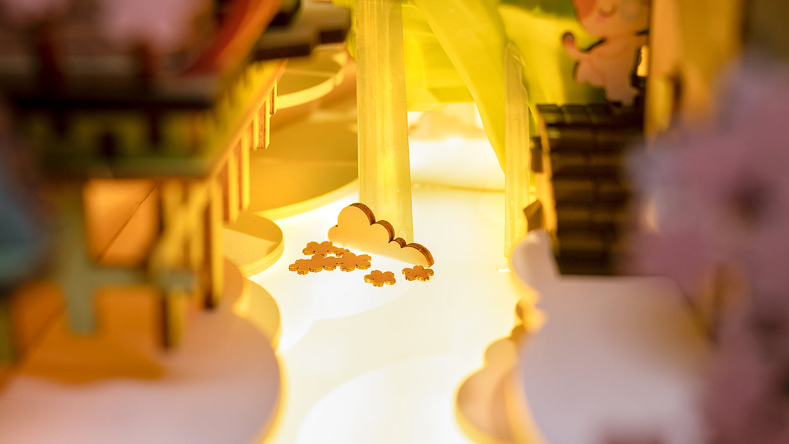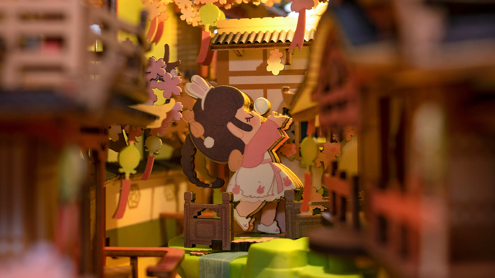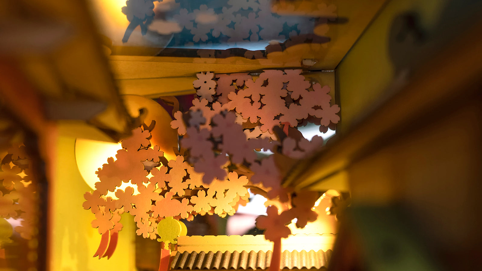 Robotime-Rolife Falling Sakura TGB05 is a creative self-assembly Book Nook kit in the form of a miniature house. We have offered you everything you need to build this mini cherry blossom wonderland - with all the wooden pieces and tools, and you will gradually recover the entire 'Falling Sakura' scene, such as the buildings, mountain valley, moon, trees, river, etc.